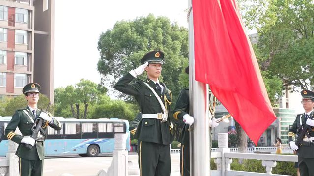 英姿飒爽的国旗护卫队迈着铿锵有力、整齐划一的步伐,护卫五星红旗走向升旗台。伴随着庄严的国歌声,全体师生肃立行礼,注视着鲜艳的五星红旗冉冉升起,迎风飘扬。