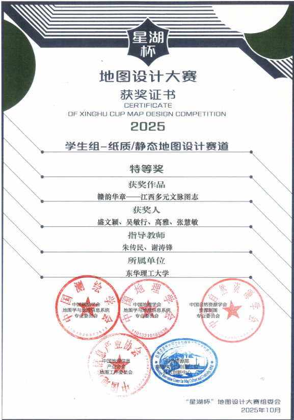 近日,第二届“星湖杯”地图设计大赛获奖名单正式公布,东华理工大学地球与行星科学学院学生盛文颖、吴敏行、高雅、张慧敏组成的参赛团队(指导教师:朱传民、谢涛锋),凭借出色表现,荣获大赛特等奖。