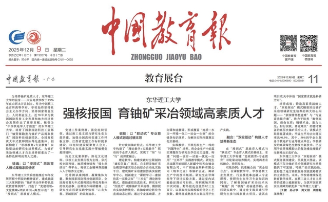 编者按:12月9日,《中国教育报》以“东华理工大学:强核报国 育铀矿采冶领域高素质人才”为题,报道东华理工大学创新构建“思政教育+专业教育”双轮驱动的研究生培养模式,为铀矿采冶领域人才自主培养探索出了一条特色鲜明的育人之路的事迹,引发社会广泛关注。现将原文转载如下: