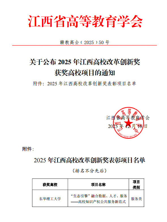 近日,2025年江西高校改革创新奖评选结果正式公布。东华理工大学申报的《“生态引擎”融合数据、人才、服务——高校知识产权公共服务新范式》项目,荣获服务类奖项。全省仅评选出4项服务类奖项。