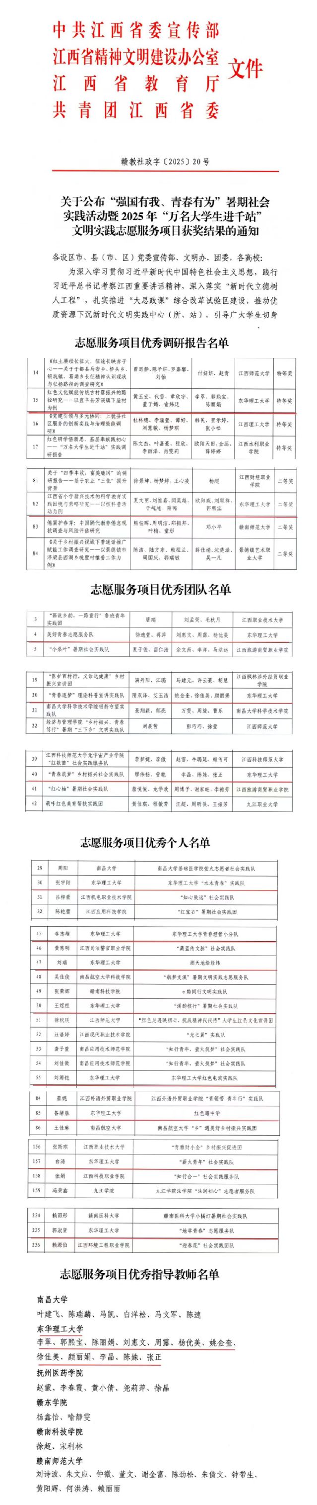 近日,中共江西省委宣传部、江西省文明办、江西省教育厅、共青团江西省委联合发布《关于公布“强国有我 青春有为”暑期社会实践活动暨2025年“万名大学生进千站”文明实践志愿服务项目获奖结果的通知》。东华理工大学在评选中表现突出,荣获多项省级荣誉。