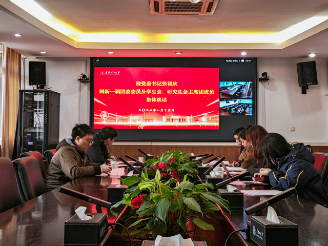 1月15日上午,东华理工大学召开新一届团委委员及学生会、研究生会主席团成员集体谈话会。校党委书记张福庆出席会议并讲话,党委常委、副校长李满根主持会议。党委常委、组织部部长金建华出席。