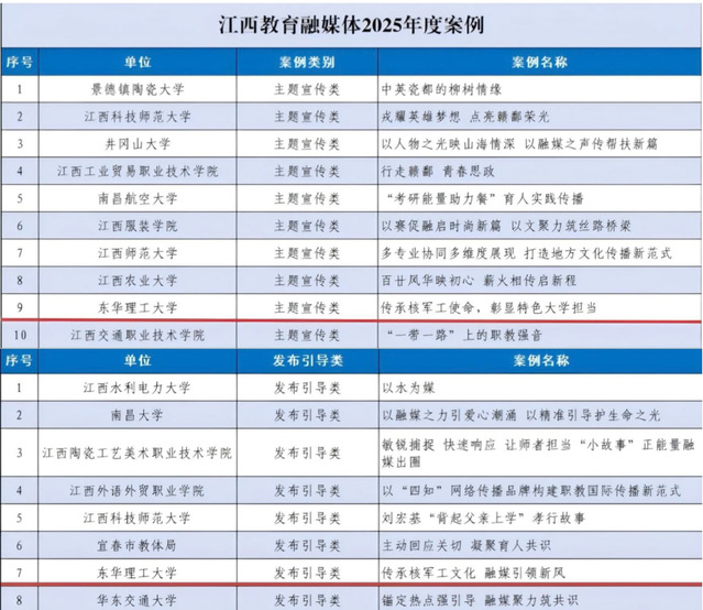 1月15日,江西省教育厅公布2025年教育融媒优秀案例评选结果,东华理工大学共有4个案例入选,入选总数并列全省第一。其中,《<硬核>让校园文化“破壁”出圈》《智能赋创作 数字绘核地》入选教育短视频2025年度案例;《传承核军工使命 彰显特色大学担当》《传承核军工文化 融媒引领新风》入选江西教育融媒体2025年度案例。