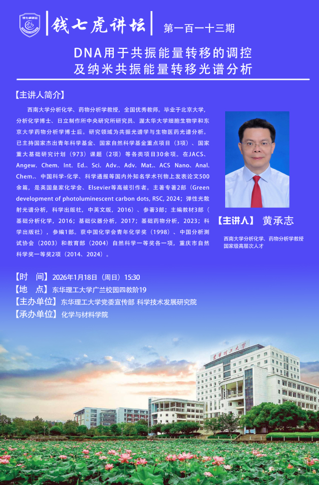 【钱七虎讲坛第一百一十三期预告】DNA用于共振能量转移的调控及纳米共振能量转移光谱分析