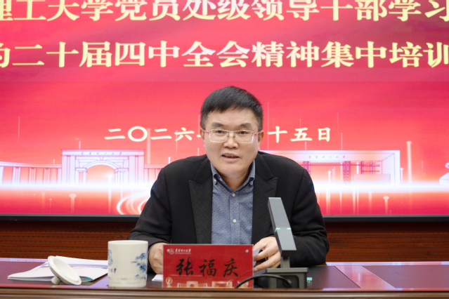 张福庆指出,深入学习贯彻党的二十届四中全会精神,是学校当前和今后一个时期的首要政治任务。举办本次集中培训班旨在引导全校党员干部充分认识学习贯彻全会精神对学校事业发展的重大意义,切实将党的二十届四中全会的战略部署转化为干部队伍的政治自觉、思想自觉、行动自觉。他强调,要把学习贯彻全会精神与落实学校“十五五”发展规划紧密结合,与当前正在推进的重点工作深度结合,重点做好五个方面工作:一要在高质量加强党的建设、筑牢办学治校政治根基上展现新担当;二要在落实立德树人根本任务、培养担当民族复兴大任的时代新人上取得新成效;三要在强化科技创新引领、服务国家高水平科技自立自强上作出新贡献;四要在实施人才强校战略、建设高水平教师队伍上实现新突破;五要在推进治理体系和治理能力现代化、提升办学治校效能上开创新局面,奋力推动党的二十届四中全会精神落地见效。他要求,全体干部要提高政治站位,牢固树立和践行正确政绩观,在学深悟透、提高站位上作表率,在对标对表、干事创业上谋实策,在担当实干、狠抓落实上当先锋,在提升能力、增强本领上下功夫,在廉洁自律、永葆本色上树标杆,以“功成不必在我”的精神境界和“功成必定有我”的历史担当,奋力谱写新时代学校高质量发展新篇章。