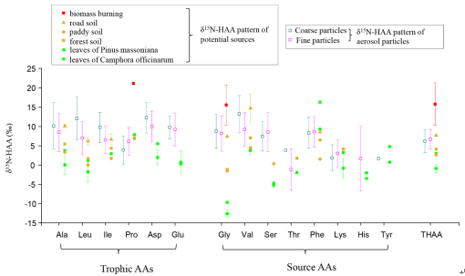 该研究发现气溶胶粗细颗粒中的蛋白质来源相近,均来自生物质燃烧、土壤和植物源。但相比细颗粒,粗颗粒中营养级氨基酸的氮同位素分布更为“分散”,营养级氨基酸有着更高的氮同位素方差(∑V)值和更低的降解指数(DI),表明气溶胶粗颗粒中蛋白质受到了更高程度的细菌降解作用。