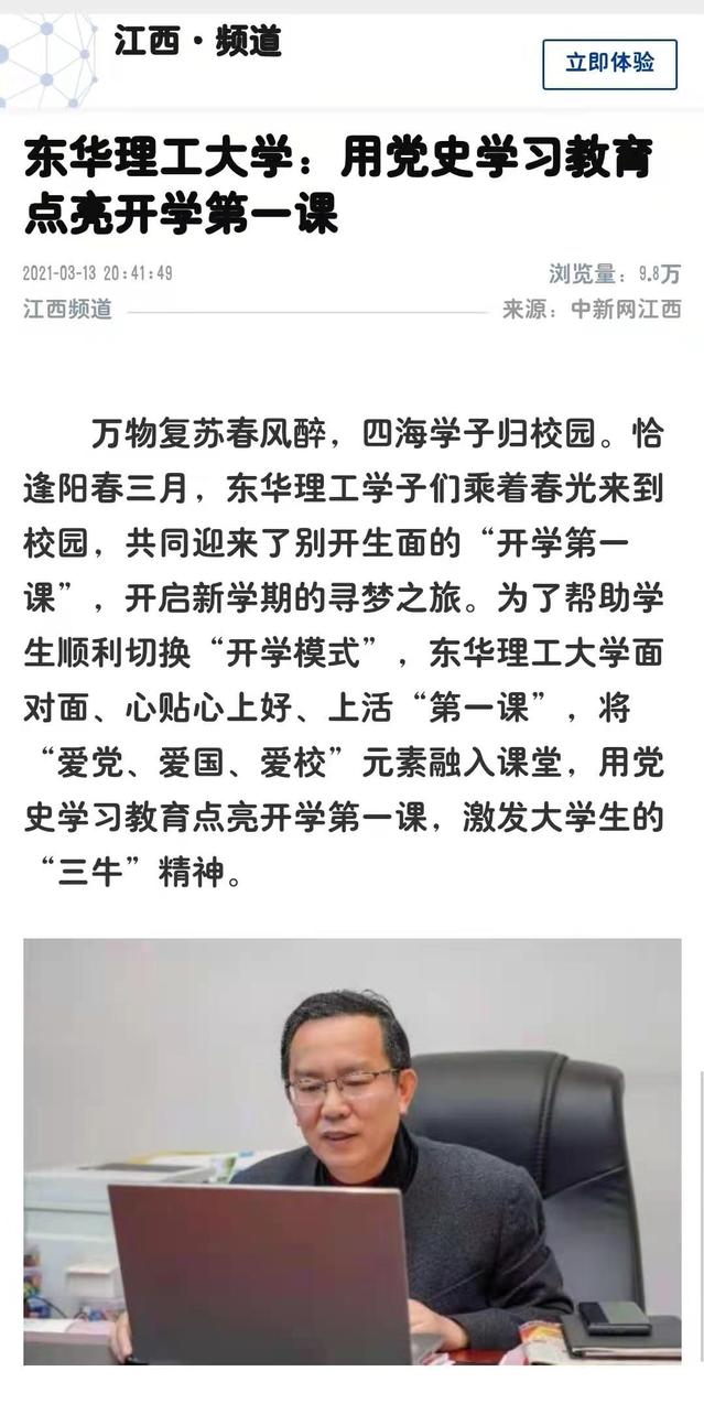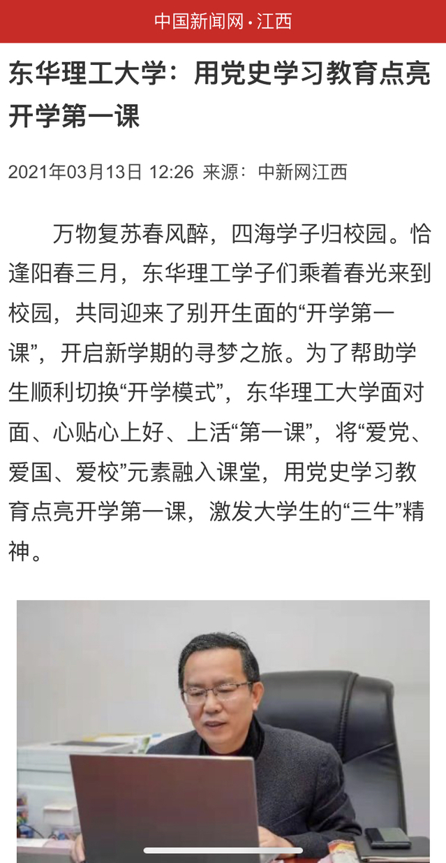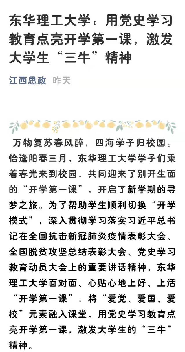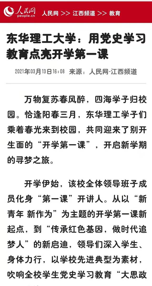 编者按:为深入贯彻习近平总书记在党史学习教育动员大会、全国脱贫攻坚总结表彰大会、全国抗击新冠肺炎疫情表彰大会上的重要讲话精神,我校精心组织了春季“开学第一课”。学校坚持以“一门为主,多门融合”的方式,面对面、心贴心地给学生们上好、上活“第一课”,用党史学习教育点亮开学第一课,激发大学生的“三牛”精神。人民网、中新网、新华社客户端、江西新闻客户端等媒体对此进行报道,现将相关内容转载如下: