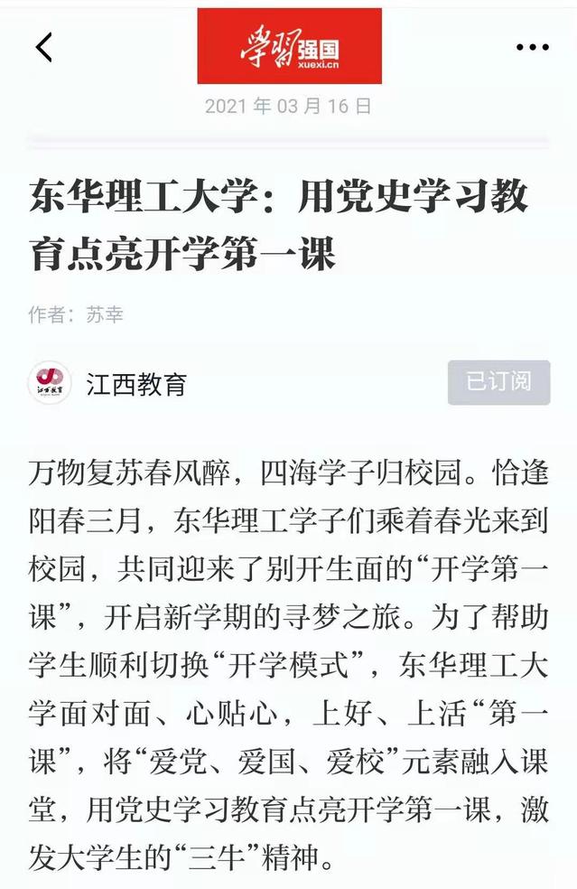 一开学,东华理工大学坚持以“一门为主,多门融合”的方式,即以思政课为主,其他课程互相融合,开学一周内集中开展不少于4学时的专题教育,以党史学习教育开局,精心组织开展“开学第一课”活动。学校通过“书记校长面对面”、研讨会、讲座、主题班会、座谈等多种方式传播爱国主义精神的最强音,力求使“开学第一课”入耳、入脑、入心,引导青年学生将个人理想抱负与祖国前途命运紧密结,争做厚实有谱、踏实靠谱、朴实不摆谱的东华理工新青年,在集体中做甘愿奉献的“孺子牛”,在学习中做创新进取的“拓荒牛”,在生活中做不计得失的“老黄牛”。