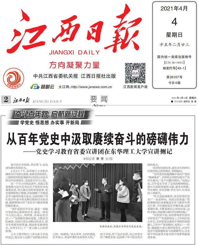编者按:4月2日下午,省委宣讲团成员、上饶师范学院党委副书记刘国云到校为师生作宣讲报告,交流党史学习心得。江西日报对此进行报道,现将内容转载如下: