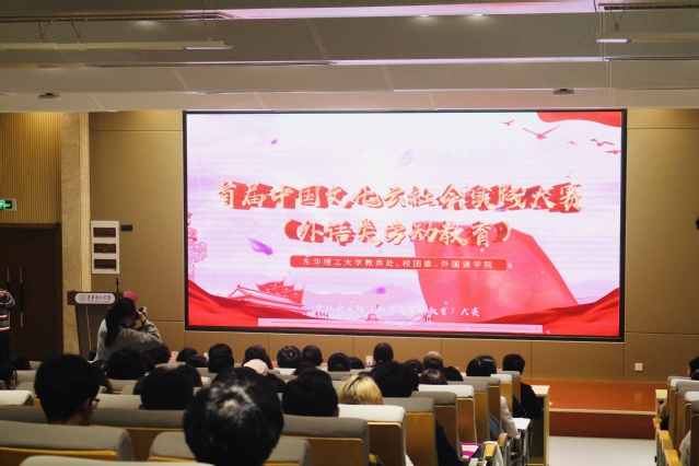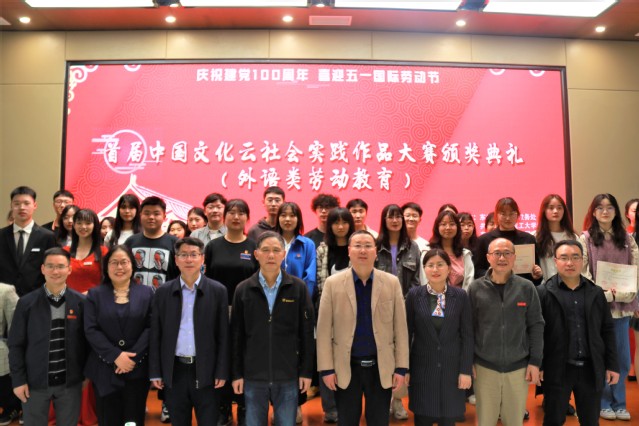 为庆祝建党100周年,喜迎五一国际劳动节,彰显“劳动最光荣”理念,教务处、校团委及外国语学院面向校内外举办了以中国文化为主题、红色文化为特色的首届中国文化云社会实践(外语类劳动教育)作品大赛,4月27日在四教阶19隆重举行颁奖典礼。副校长郭福生到场颁奖,教务处、校团委、外国语学院以及南昌航空大学国际教育学院相关负责人出席颁奖大会。