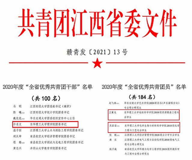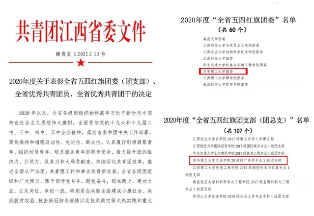 其中,东华理工大学团委获2020年度“全省五四红旗团委”称号;文法学院2018级广告学专业2班团支部获2020年度“全省五四红旗团支部”称号;理学院团委书记许名文同志获“全省优秀共青团干部”称号;地球科学学院王翼龙、化学生物与材料科学学院吴苗苗同学获“全省优秀共青团员”称号。