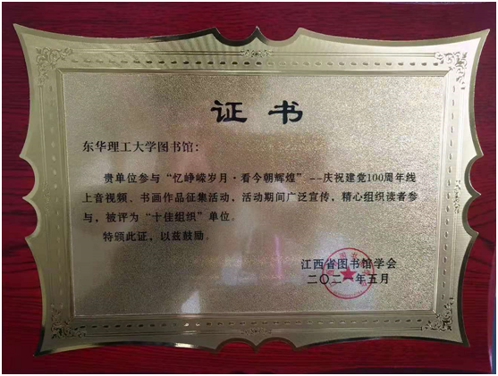 近日,在江西省图书馆学会联合江西省图书馆举办的“忆峥嵘岁月,看今朝辉煌”——庆祝建党100周年线上作品征集活动中,我校被评为“十佳组织”单位。
