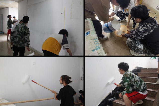 同学们先对原旧墙面上的胶带和铁钉进行了清理,然后将坑坑洼洼的墙面进行填补找平,最后再用白色乳胶漆将墙面重新粉刷。同学们对该活动表现出极高的热情,公寓楼道到处穿梭着同学们忙碌的背影,同学们彼此相互配合,共同协作,很快便完成了工作。结束工作后,同学们主动地将地面清理干净并收拾好劳动的工具。