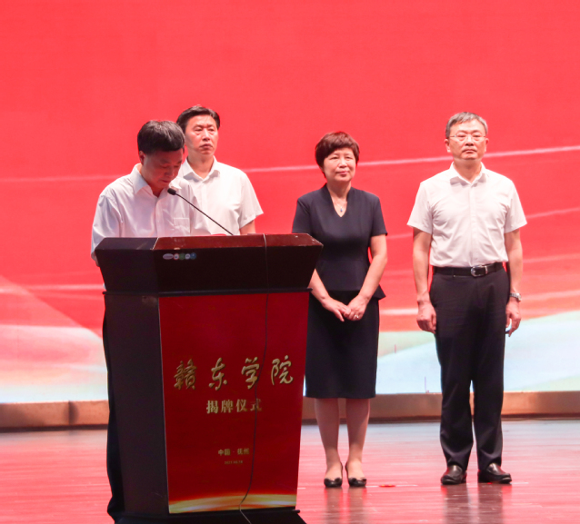 6月18日上午,赣东学院揭牌仪式在我校抚州校区大礼堂举行。抚州市委书记张鸿星,省委教育工委副书记、省教育厅厅长郭杰忠出席并共同为赣东学院揭牌;抚州市委副书记、市长夏文勇,校党委副书记、校长孙占学分别致辞;校党委书记范小林,省自然资源厅二级巡视员王亚平,校党委副书记、赣东学院过渡期管委会党工委书记刘紫春,市领导李高兴、肖承贵、蔡青,市委秘书长赵立,市政府秘书长吴猛强,市直有关部门、市属高校主要负责同志,赣东学院过渡期管委会全体成员以及师生代表共计400余人出席该仪式。抚州市委副书记杨文斌主持揭牌仪式。