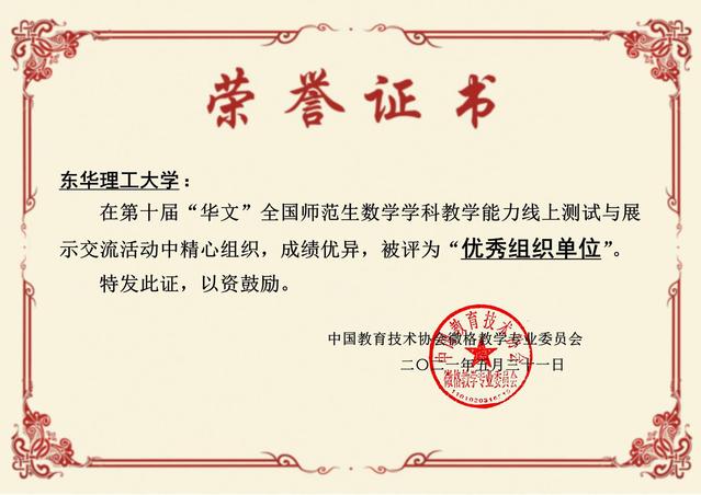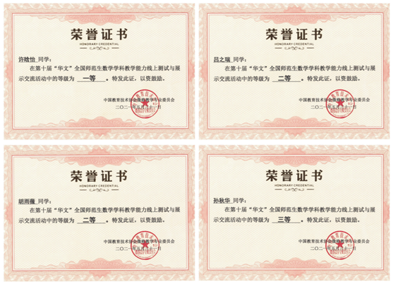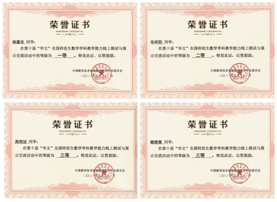 近日,由中国教育技术协会微格教学专业委员会主办、广西师范大学承办的2021年第十届华文全国师范生数学学科教学能力线上测试与展示交流活动圆满落下帷幕。我校选派了来自抚州师范学院2020级学科教学数学专业(研究生组)和2019级数学与应用数学专业(本科生组)两支代表队共8名学生参赛,陈火弟、谢来福为指导老师。活动历时30天,我校团队表现出色,获得了一等奖(一级)2项、二等奖(二级)3项、三等奖(三级)3项的好成绩,我校还荣获优秀组织奖。