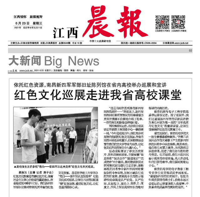 编者按:为庆祝建党100周年,弘扬红色文化,推动党史学习教育走深走实,6月22日上午,我校联合新四军军部旧址陈列馆在工程训练中心一楼成功举办《南昌——新四军从这里走来》主题巡展活动,江西教育电视台、江西晨报对此进行报道,现将相关内容转载如下: