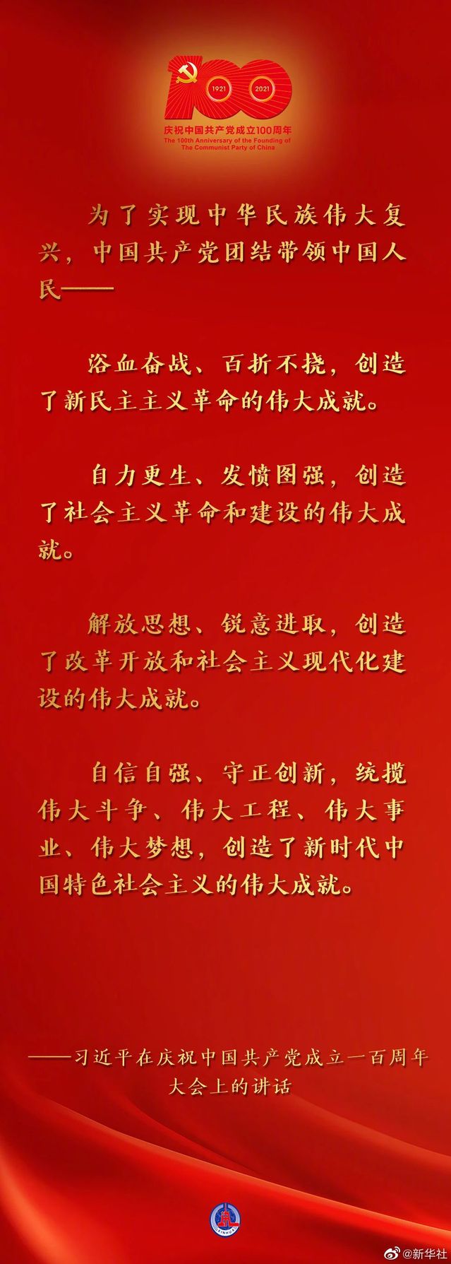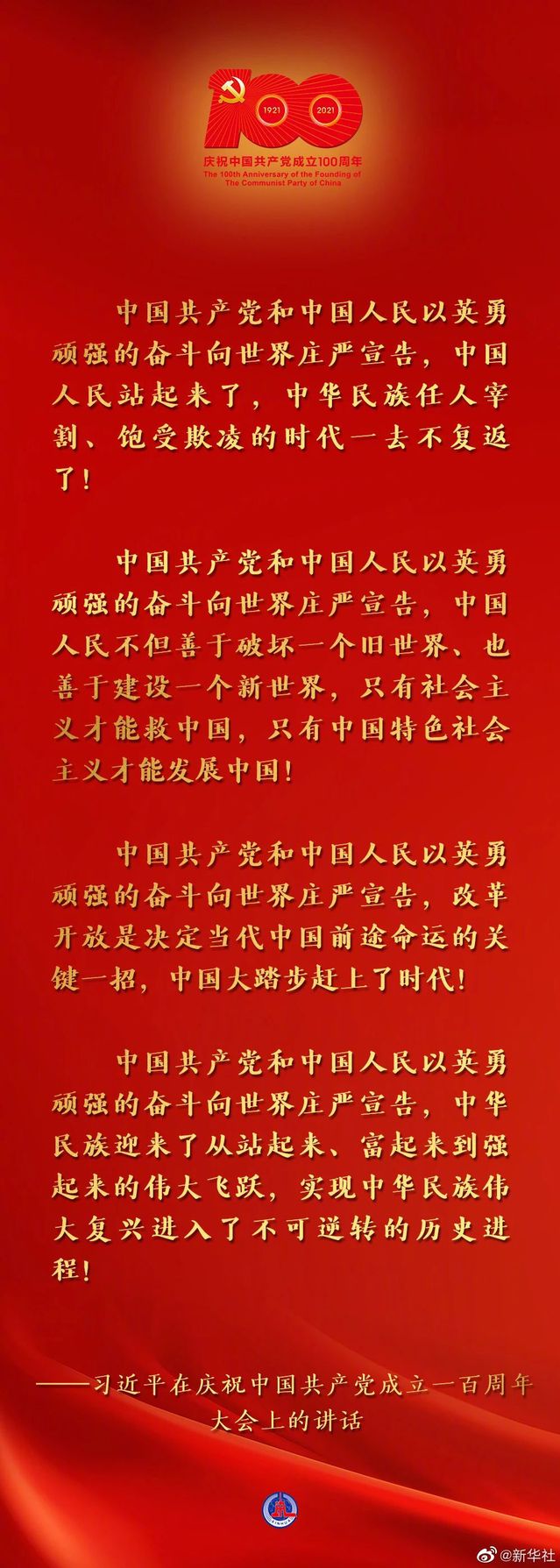 7月1日上午,庆祝中国共产党成立100周年大会在北京天安门广场隆重举行。中共中央总书记、国家主席、中央军委主席习近平发表重要讲话。以下是金句总结(转自新华社):