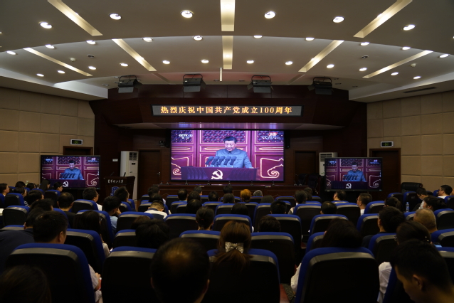 7月1日上午8点,庆祝中国共产党成立100周年大会在首都隆重举行。机关党委在行政楼一楼报告厅组织全体机关党员干部集中收看大会实况直播,在家校领导与机关党员干部一同收看。