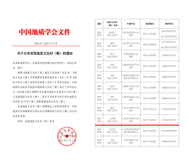 近日,从中国地质学会获悉,由我校旅游地学团队负责规划建设的大洲塘地质文化村成功获批全国首批地质文化村(挂牌筹建)。