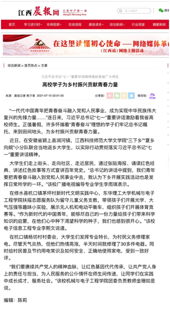 编者按:为深入学习贯彻习近平总书记“七一”重要讲话精神,引导和帮助广大青年学生上好与现实相结合的“大思政课”,在社会课堂中受教育、长才干、作贡献,在观察实践中学党史、强信念、跟党走。近日,我校机械与电子工程学院扶摇志愿服务队来到修水县杭口镇开展“永远跟党走 奋进新时代”主题暑期新时代文明实践活动。江西教育电视台、江西晨报对此进行报道,现将相关内容转载如下: