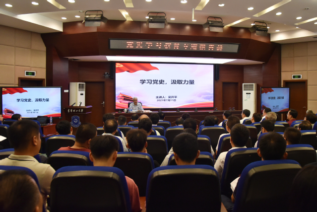 吴开平以《学习党史 汲取力量》为题,结合重大事件、重要人物等历史资料,带领与会人员全面回顾了改革开放和核工业发展的光辉历程,深刻感悟了中国共产党的思想伟力、为民情怀和精神力量,详细讲述了江西红土地上的红色故事,激励全校师生争做红色基因的传承者和实践者。