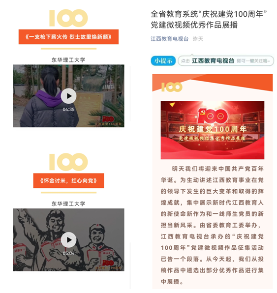 为庆祝建党100周年,生动讲述我校教育事业在党的领导下发生的变化和取得的成绩,集中展示新时代东华理工人的新使命新作为和一线师生党员的新担当新风采,校党委组织开展了“庆祝建党100周年”党建微视频征集活动,在全校营造了庆祝中国共产党成立100周年的浓厚氛围。经审核、筛选,我校向江西教育教育电视台选送了近30个优秀党建微视频作品。