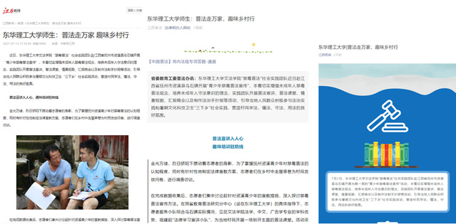 2021年7月1日,东华理工大学文法学院“禁毒普法”社会实践团队赴江西省抚州市资溪县乌石镇开展“青少年禁毒普法宣传”,本着切实增强未成年人禁毒普法观念、培养未成年人守法意识的理念,实践团队开展普法宣讲、普法课堂、情景短剧、汇报晚会以及制作法治手抄报等活动,引导当地人民群众积极参与暑期文化科技卫生“三下乡”社会实践活动,营造村民学法、懂法、守法、用法的良好氛围。
