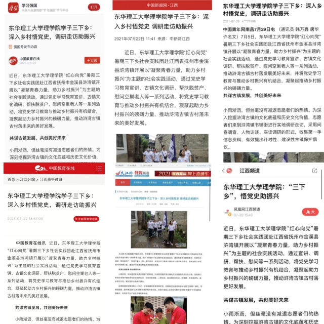 编者按:暑假期间,我校理学院“红心向党”暑期三下乡社会实践团赴江西省抚州市金溪县浒湾镇开展以“凝聚青春力量,助力乡村振兴”为主题的社会实践活动,通过党史学习教育宣讲、古镇文化调研、帮扶脱贫户、慰问空巢老人等一系列活动,将党史学习教育与推动乡村振兴有机结合,凝聚起助力乡村振兴的磅礴力量。学习强国、中国新闻网、中国青年网、中国教育在线等媒体对此进行报道,现将相关报道转载如下: