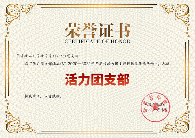 近三年来,1823601团支部积极进取,硕果累累。团支部获2019年江西省暑期“三下乡”社会实践优秀服务队、2020年江西省暑期“三下乡”社会实践优秀调研报告;获2020年江西省“红色走读”竞赛三等奖;支部成员在科技创新竞赛上获国际级荣誉20人次,国家级荣誉30余人次,省级荣誉30余人次,校级荣誉150余人次,2019、2020年连续两次获“东华理工大学优秀班集体”等荣誉。