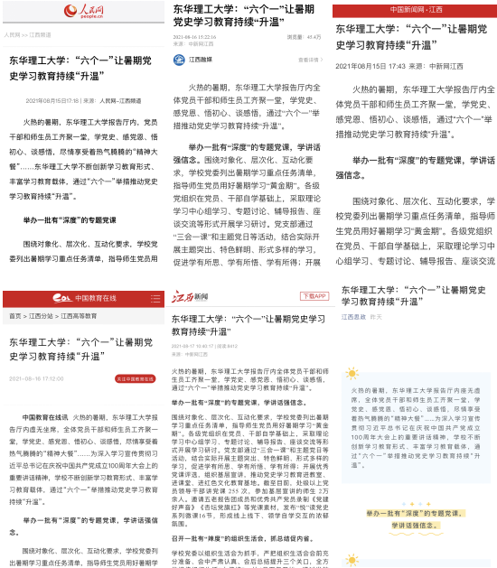 编者按:2021年暑期,东华理工大学通过举办一批有“深度”的党课、召开一批有“辣度”的组织生活会、开展一批有“热度”的暑期社会实践活动、推出一批有“高度”的调研成果、解决一批有“温度”的师生急难愁盼问题、推进一批有“鲜度”的课程思政、思政课程暑期创新提升工程等活动,确保党史学习教育在暑期“不放松、不断线”。人民网、新华社客户端、中新网、中国教育在线、江西新闻客户端、江西思政等对此进行报道,现将相关内容转载如下: