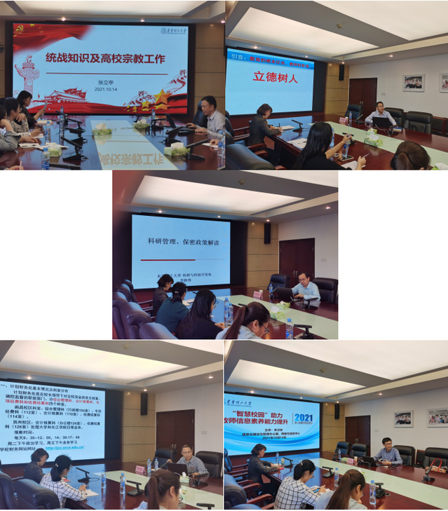 党委统战部、教务处、科研与科技开发处、计划财务处、网络与信息中心等部门负责人分别就意识形态与宗教、教学规范与课程思政、科学研究与学术规范、财经制度与财经纪律、信息安全与智慧校园等方面为新入职教师进行了专题培训。(图/陈婷 杨荣 文/杨荣 余燕)