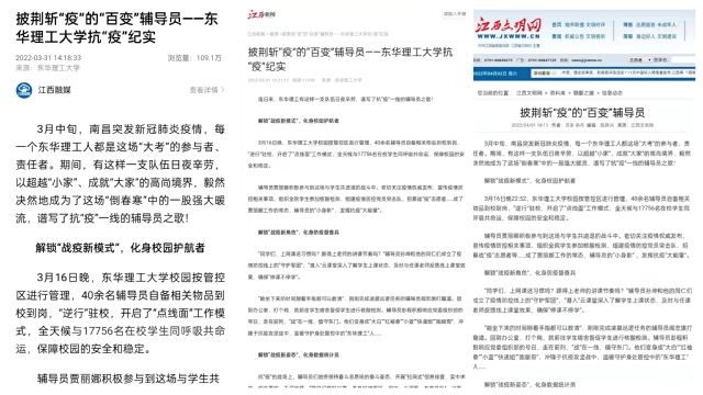 编者按:面对严峻的疫情防控形势,东华理工大学有这样一支队伍日夜辛劳,坚守岗位,与同学们同心同力,守望相助,以超越“小家”、成就“大家”的信念,毅然决然地成为了这场“倒春寒”中的一股强大暖流,谱写了抗“疫”一线的辅导员之歌。新华社客户端、江西新闻客户端、江西文明网等对此进行报道,现将相关内容转载如下: