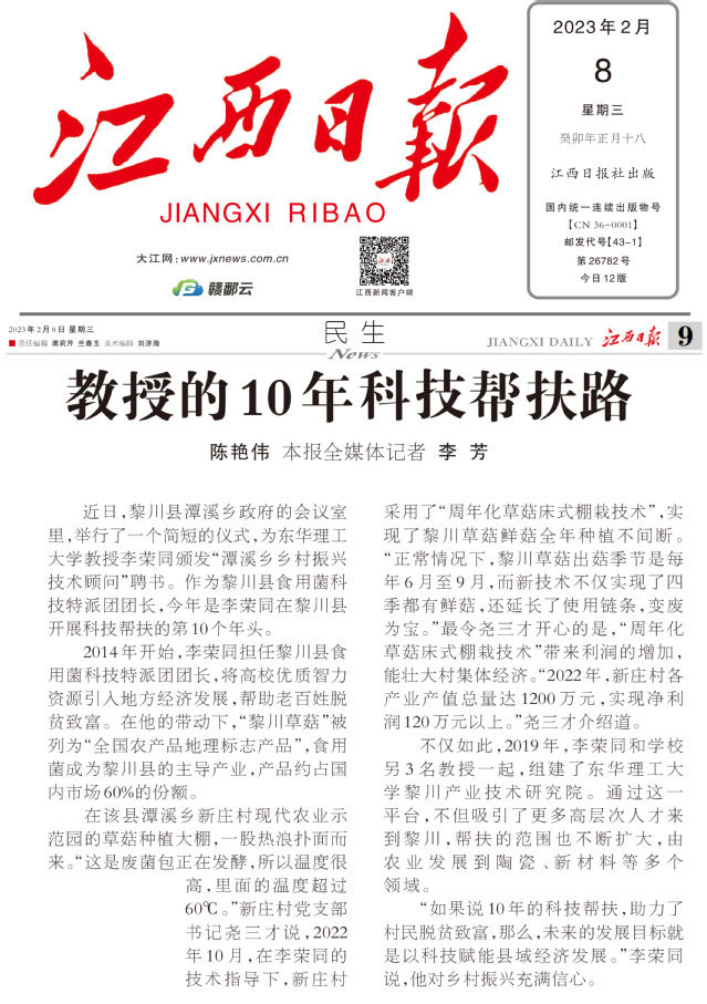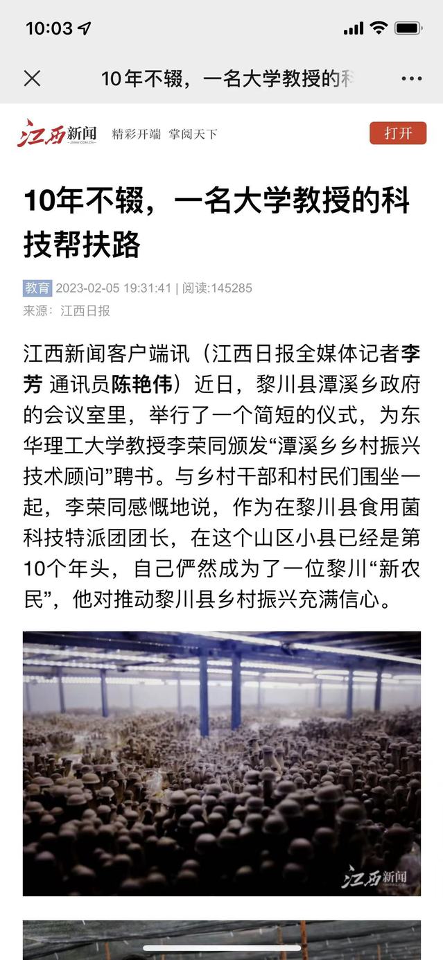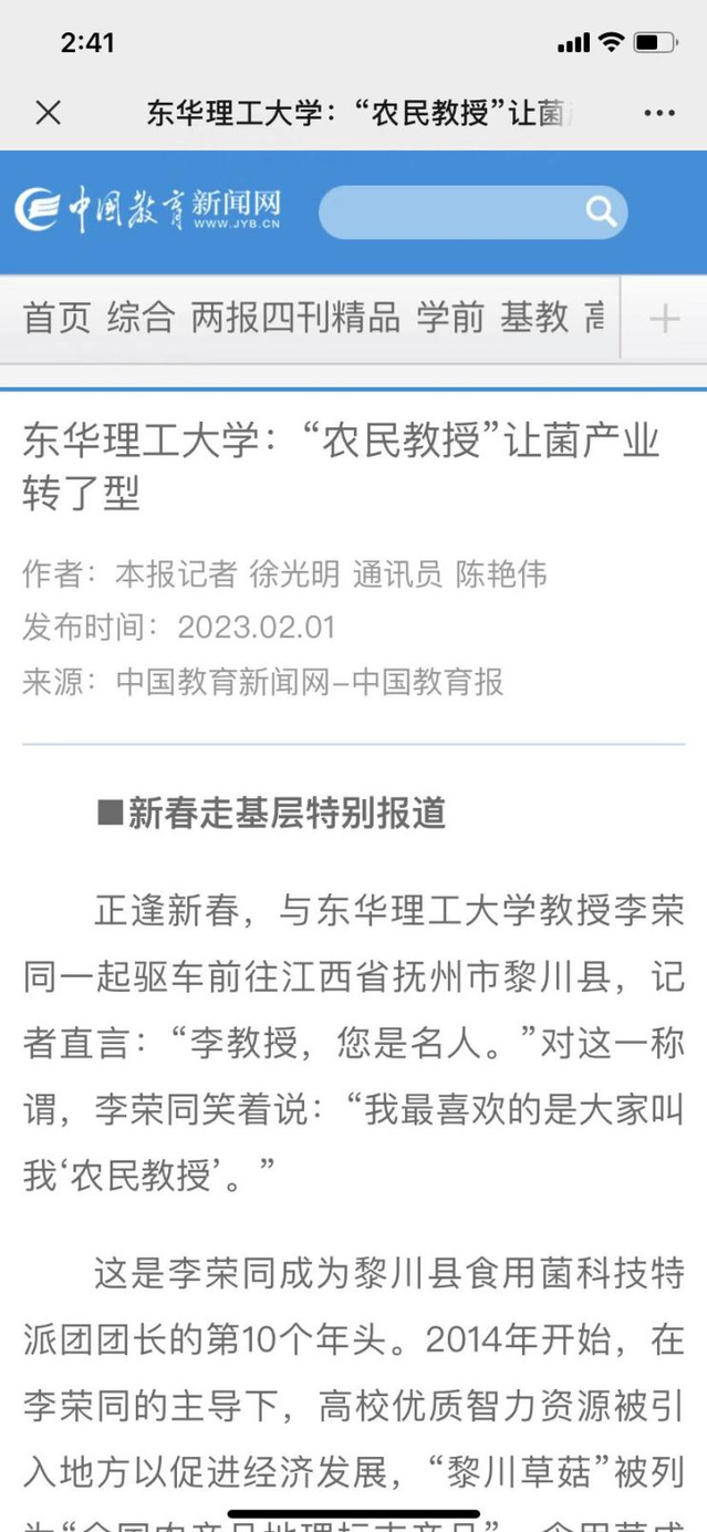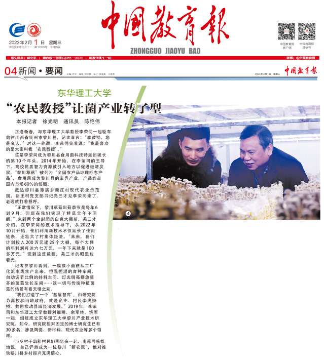 编者按:2月1日,《中国教育报》第四版“新闻·要闻”以“东华理工大学:‘农民教授’让菌产业转了型”为题报道我校李荣同教授助推黎川县菌产业转型,助力黎川县乡村振兴的先进事迹,引发社会广泛关注,现将原文转载如下: