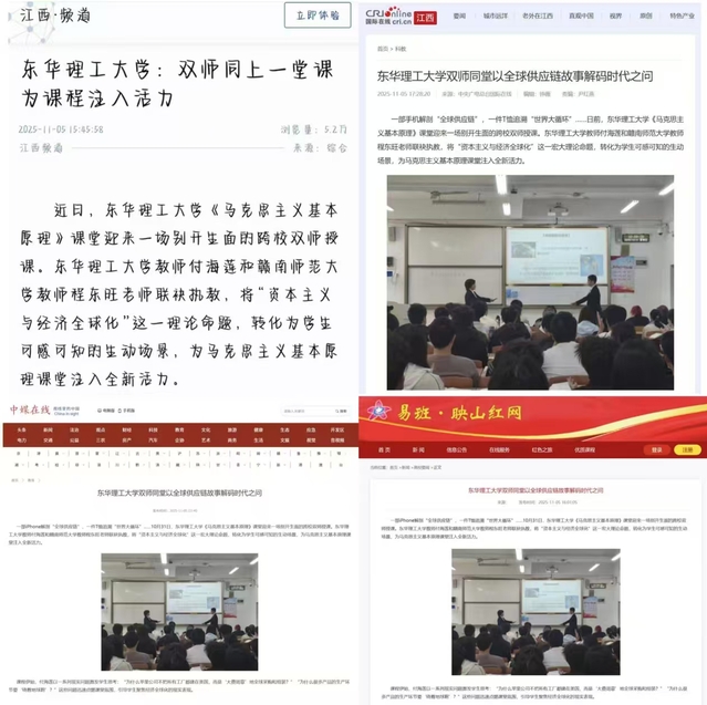 编者按:10月31日,在《马克思主义基本原理》课堂上,东华理工大学教师付海莲和赣南师范大学教师程东旺老师联袂执教,将“资本主义与经济全球化”这一宏大理论命题,转化为学生可感可知的生动场景,为马克思主义基本原理课堂注入全新活力。新华社客户端、国际在线、中媒在线、映山红网等主流媒体对此进行报道,引发社会广泛关注。现将原文转载如下: