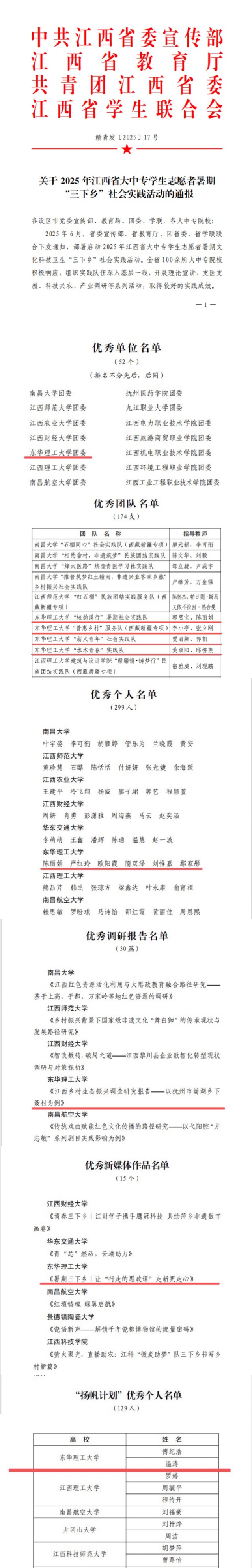近日,中共江西省委宣传部、江西省教育厅、共青团江西省委、江西省学生联合会四部门联合发布了《2025年江西省大中专学生志愿者暑期“三下乡”社会实践活动的通报》(赣青联发〔2025〕17号),东华理工大学在多项评选中表现突出,荣获集体与个人多项省级荣誉。
