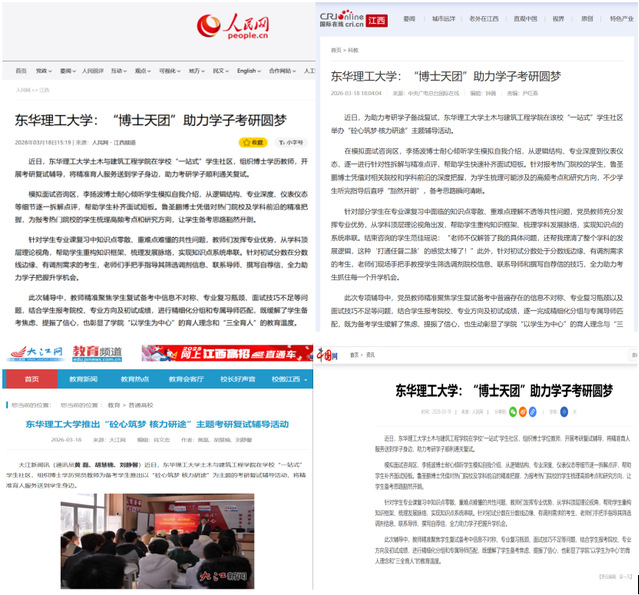 编者按:近日,东华理工大学土木与建筑工程学院在学校“一站式”学生社区,组织博士学历党员教师为备考学生推出以“砼心筑梦·核力研途”为主题的考研复试辅导活动。人民网、国际在线、中国网、大江网等主流媒体对此进行报道,引发社会广泛关注。现将原文转载如下: