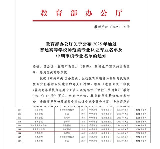 近日,教育部办公厅正式发布了《教育部办公厅关于公布2025年通过普通高等学校师范类专业认证专业名单及中期审核专业名单的通知》(教师厅函〔2025〕18号),东华理工大学体育教育专业顺利通过师范类第二级专业认证,认证结论为“有条件”通过,有效期为六年,自2025年9月起至2031年8月止。(图/文 雷乐乐)