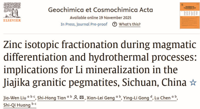 近日,东华理工大学铀资源探采与核遥感全国重点实验室、地球与行星科学学院田世洪研究员团队,在国际权威地学期刊《Geochimica et Cosmochimica Acta》发表了题为《Zinc isotopic fractionation during magmatic differentiation and hydrothermal processes: implications for Li mineralization in the Jiajika granitic pegmatites, Sichuan, China》(DOI: 10.1016/j.gca.2025.11.031)的研究成果。该研究以东华理工大学为第一署名单位,学校地质资源与地质工程专业2023级博士研究生刘嘉文为论文第一作者,田世洪为通讯作者。