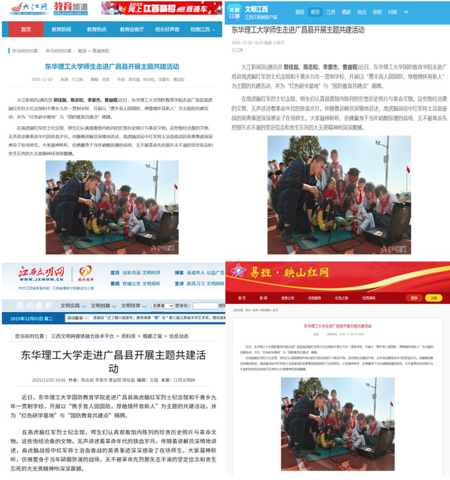 编者按:近日,东华理工大学国防教育学院走进广昌县高虎脑红军烈士纪念馆和千善乡九年一贯制学校,开展以“携手育人固国防,厚植情怀育新人”为主题的共建活动,并为“红色研学基地”与“国防教育共建点”揭牌。大江网、文明江西、江西文明网、映山红网等主流媒体对此进行报道,引发社会广泛关注。现将原文转载如下: