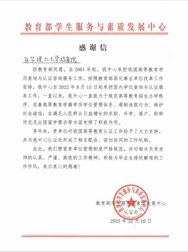 近日,教育部学生服务与素质发展中心(以下简称“中心”)向东华理工大学发出感谢信,对学校档案馆在高等教育学历学位认证工作中所给予的长期支持与密切协作表示感谢。