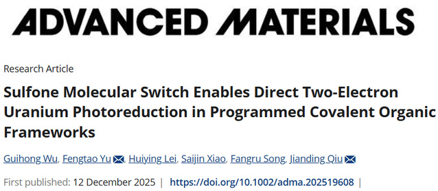 近日,东华理工大学化学与材料学院邱建丁教授、余峰涛副教授团队在复杂环境铀分离提取领域取得关键突破,并在国际材料领域权威期刊《Advanced Materials》上发表了题为“Sulfone Molecular Switch Enables Direct Two-Electron Uranium Photoreduction in Programmed Covalent Organic Frameworks”的研究成果。学校2023级化学专业硕士研究生吴桂宏、余峰涛副教授为论文共同第一作者,邱建丁教授、余峰涛副教授为共同通讯作者。