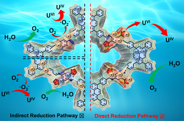 研究团队创新性地提出了“砜基分子开关”策略,成功将共价有机框架材料(COFs)中铀的光还原路径从间接超氧化物介导过程转变为直接的双电子转移过程,从而显著提升了铀的提取容量与选择性。该研究通过精准的分子工程,调控光生电子传递路径,有效抑制了竞争性副反应,稳定了关键中间体。该成果不仅为复杂水体中铀的高效、选择性回收提供了新方法,更在机制上,为通过分子设计调控光催化系统的氧化还原路径建立了一个普适性范式,为开发应用于能源与环境领域的先进材料开辟了新途径。