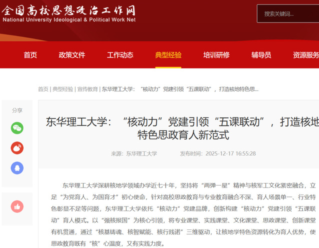 编者按:12月17日,全国高校思想政治工作网报道东华理工大学依托“核动力”党建品牌,创新构建“核动力”党建引领“五课联动”育人模式事迹,引发社会广泛关注。现将相关报道转载如下: