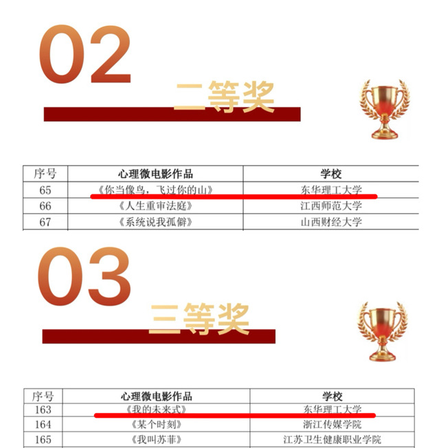 近日,第五届全国高校心理微电影(心理短视频)优秀作品展示活动公布评选结果。东华理工大学2部心理微电影作品获奖,其中《你当像鸟,飞过你的山》荣获二等奖,《我的未来式》荣获三等奖。