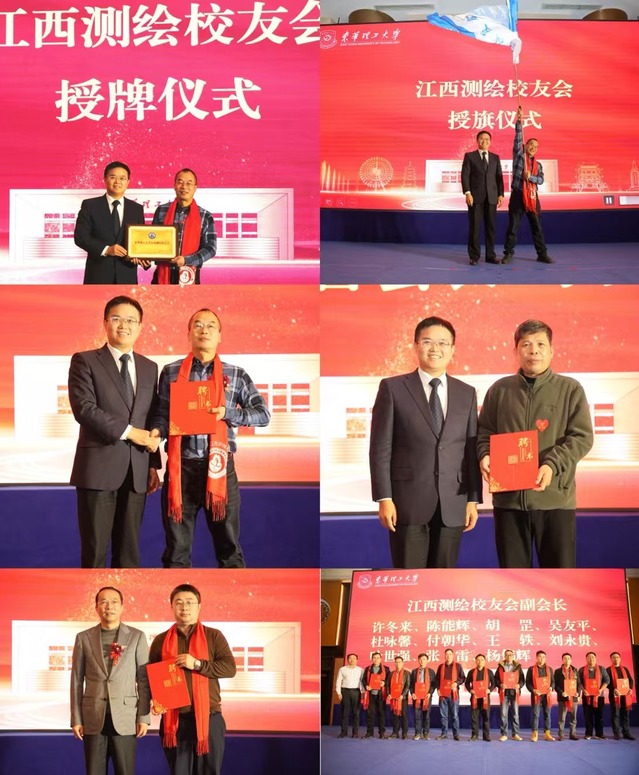 学校领导及相关部门负责人为第一届江西测绘校友会授牌、授旗,并分别为理事会成员颁发聘书。